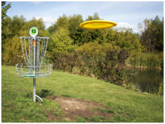 Beim Discgolf geht es darum, eine Wurfscheibe (Disc oder auch Frisbee) mit moeglichst wenigen Wuerfen in das Ziel, einem sogenannten Korb (Disc-Korb) zu