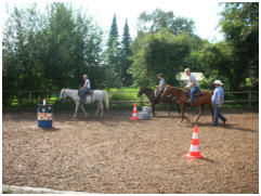Im zweiten Teil des Trainings duerfen die Teilnehmer reiten. Auf dem Reitplatz der Ranch umrunden die