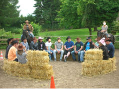 Im zweiten Teil des Trainings duerfen die Teilnehmer reiten. Auf dem Reitplatz der Ranch umrunden die
