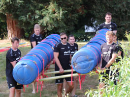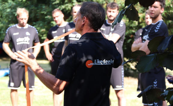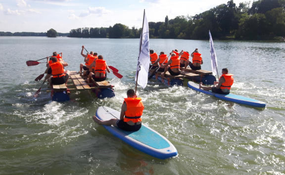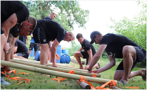 Auf dem Gelaende der Gustav-Heinemann-Bildungsstaette in Bad Malente am Kellersee haben wir fuer den THW Kiel im Rahmen der Saisonvorbereitung 2020 / 21 ein Teambuilding organisiert und durchgefuehrt. Ausgewaehlt haben die THW-Verantwortlichen unser Teambuilding ‚Flossbau‘. Bei allerbestem Sommerwetter startete unser Trainer Andreas Koester das Programm mit einem koordinativen Teamspiel. Gut aufgewaermt ging es danach an die eigentliche Aufgabe, dem Bau zweier Floesse mit anschliessender Wettfahrt ueber den See. Dazu wurden die Teams „Alt“ und „Jung“ gebildet. Als kleine Zusatzaufgabe galt es, den jeweils Teamaeltesten auf einem SUP-Board hinterherzuziehen. Je Team wurde eine THW-Fahne verteilt, die waehrend der gesamten Wettfahrt sichtbar im Fahrtwind zu wehen hatte. Nachdem beide Teams von unserem Trainer Klaus Kluender mit der Knotentechnik vertraut gemacht wurden, startete bereits in der Bauphase ein heisser Fight um die beste Konstruktion. Am Ende hatte das Team „Alt“ u.a mit Steffen Weinhold, Patrick Wiencek, Pavel Horak, Hendrik Pekeler und Domagoj Duvnjak nicht nur beim Flossbau gegen Team „Jung“ u.a. mit Rune Dahmke und Sven Ehrig die Nase vorn. Auch die Wettfahrt mit dem Floss konnte Team ‚Alt‘ fuer sich entscheiden. Beim abschliessenden, von uns exklusiv am Seeufer angerichteten Buffet fand die Mannschaft um die Trainer Filip Jicha und Christian Sprenger sowie Athletiktrainer Hinrich Brockmann inmitten der sehr anstrengenden Saisonvorbereitung ein wenig Entspannung.